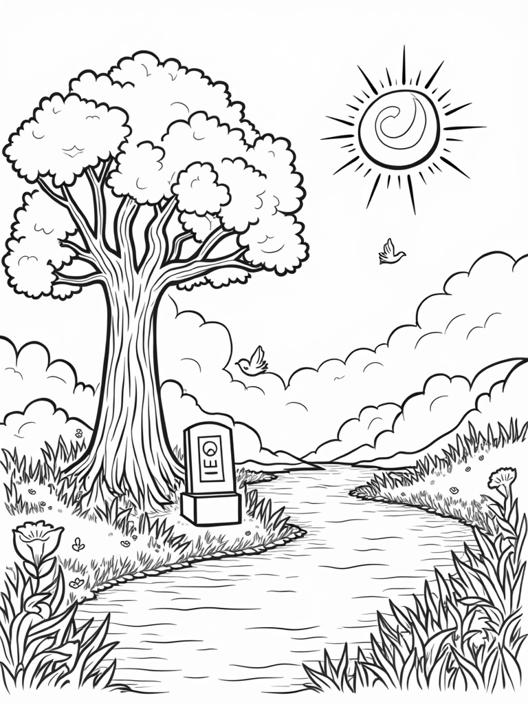 This coloring page showcases a beautiful garden scene, complete with a huge tree at its center. The leaves of this majestic tree are shaped like golden crowns, making it a real showstopper! Underneath the tree, there’s a stone tablet resting on a pedestal, which is etched with mysterious ancient symbols. Nearby, a gentle river flows, surrounded by colorful flowers and twisting vines, adding a touch of vibrancy to the peaceful setting.