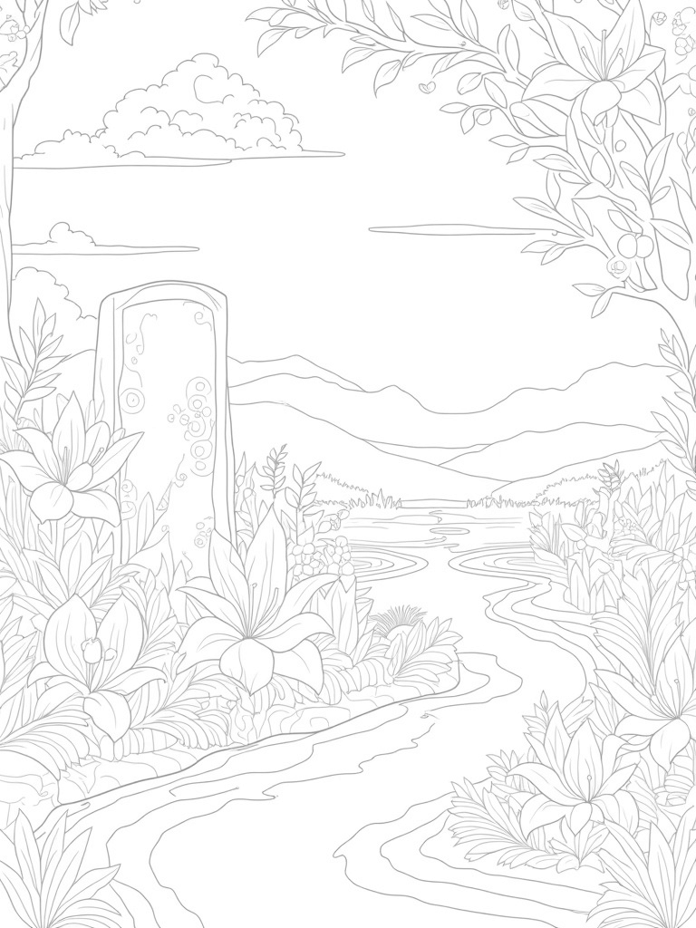 Check out this free, printable coloring page featuring a tranquil garden filled with oversized lilies, a giant stone tablet, and a golden tree. Perfect for kids who love nature and exploring new worlds through art!