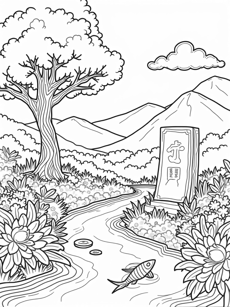 Tranquil Garden with Ancient Tree and Flowing River Coloring Page