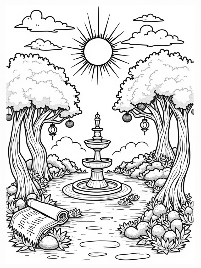 Check out this free, printable coloring page featuring a tranquil garden with a fish fountain and doves. Perfect for kids who love nature and Bible stories, it's a fun way for them to express their creativity!