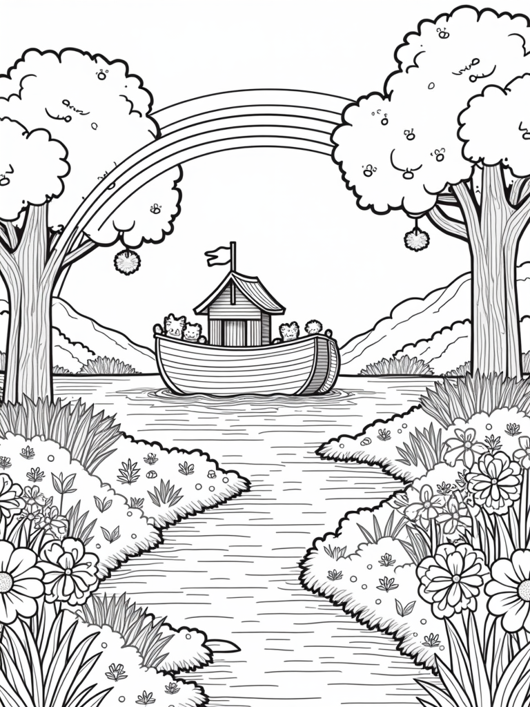 At the center of it all, a beautiful ark floats serenely on the water. It’s an inviting sight, especially with pairs of playful animals peeking over the edge, curious about what’s happening around them. Can you spot your favorite animals? They look like they’re having a great time! And just above, a rainbow stretches across the sky, shining bright and bringing even more color to this enchanting scene.