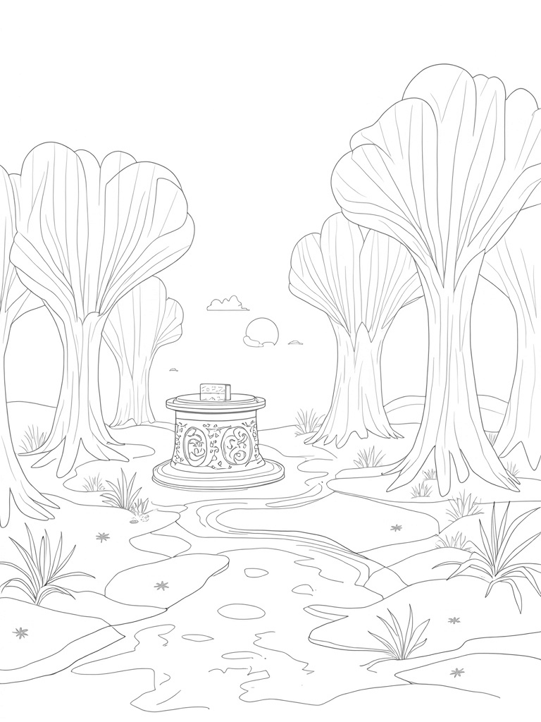 This beautiful garden scene is filled with towering trees that bear unique fruits shaped like ancient scrolls. Right in the center, there’s a sparkling well with intricate stonework that catches the sunlight, creating lovely patterns on the grass. Nearby, you’ll find a large stone tablet with flowing lines and symbols, adding a touch of mystery to the garden.