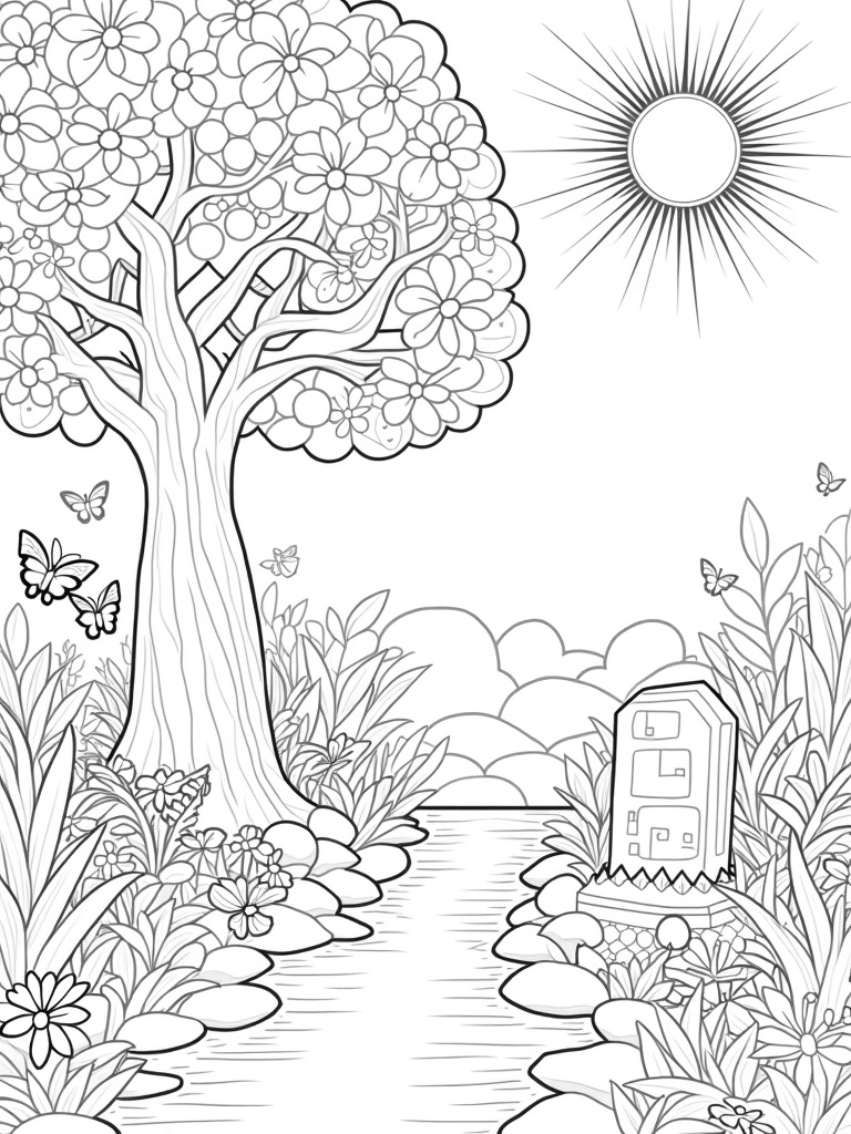 Tranquil Garden with Towering Tree and Butterflies Coloring Page