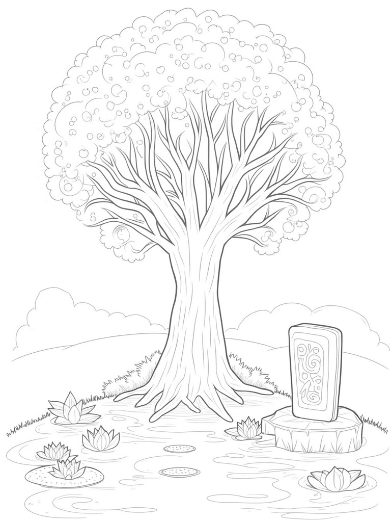 This coloring page showcases a magnificent tree of life that towers above everything else. Its sprawling branches are filled with glowing golden apples that look like they could light up a whole room! At the base of the tree, a peaceful river flows gently, sprinkled with lily pads and tiny fish swimming around. Nearby, a stone tablet rests on a mossy pedestal, covered in mysterious symbols that spark the imagination.