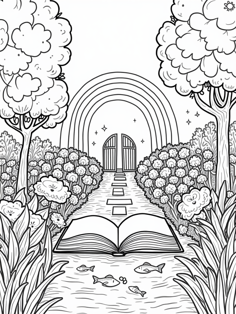 Whimsical Garden with a Giant Book and Rainbow Coloring Page
