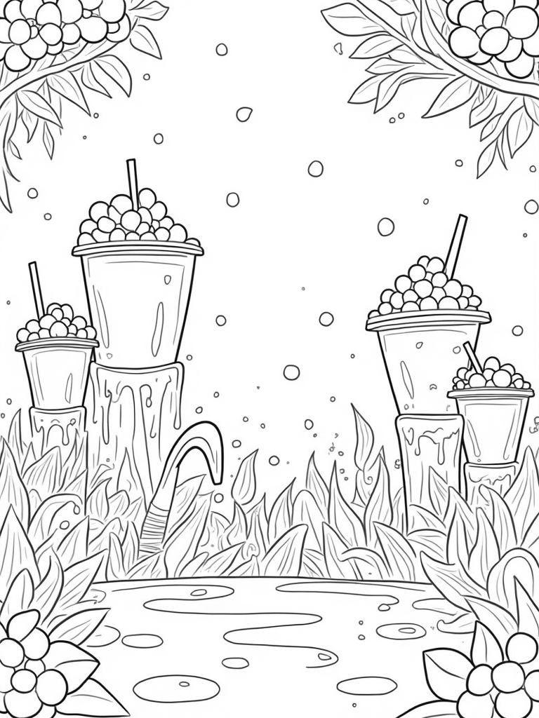 Boba Bubble Garden with Tapioca Flowers and Colorful Tea Coloring Page