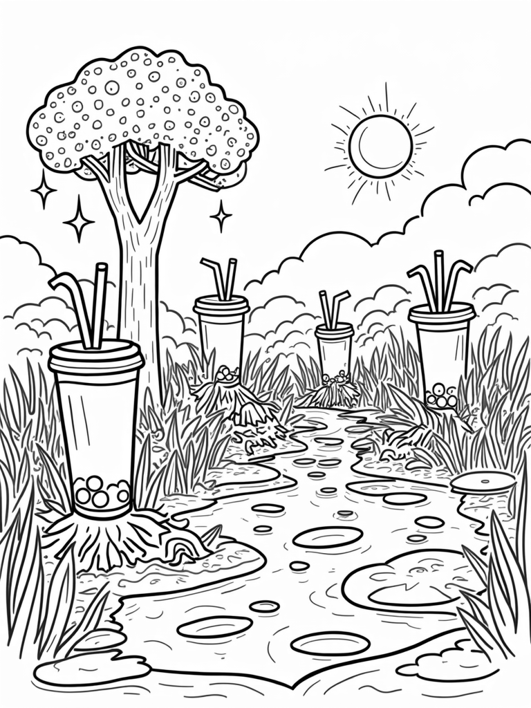 Check out this free, printable coloring page featuring a boba bubble tea garden! With oversized cups, a tea leaf tree, and rainbow paths, it’s a fun and colorful scene just waiting for your creative touch.
