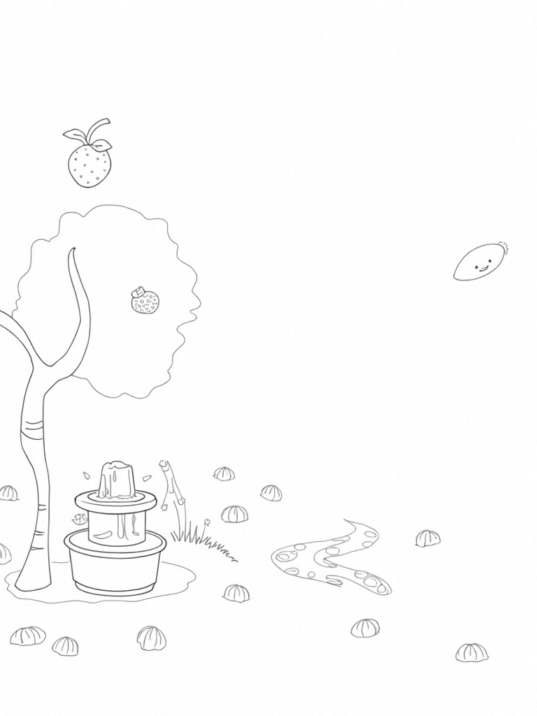 Look up, and you'll see playful fruit-shaped lanterns hanging from the branches, casting fun shadows on the soft grass below. And don't forget about the giant, smiling mango floating above, its juice trickling down like a gentle waterfall. It’s a scene bursting with joy, perfect for adding your favorite colors!