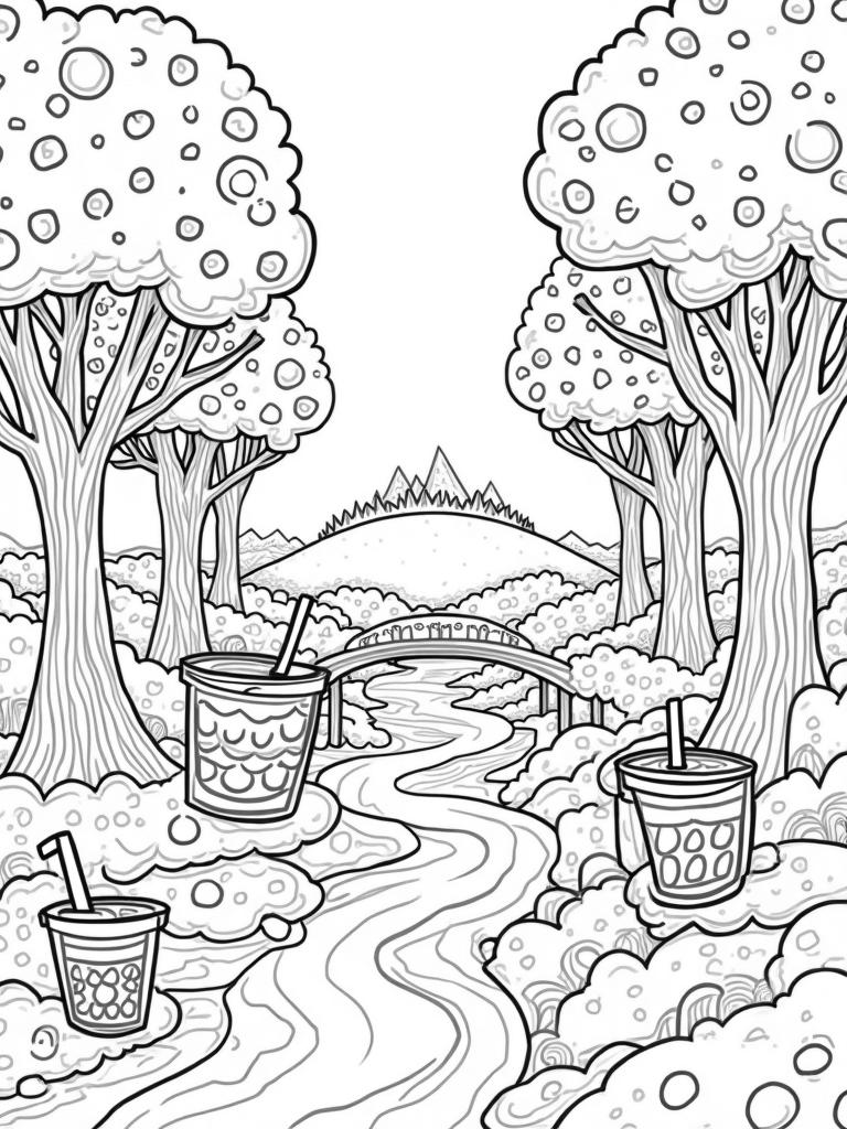 Boba Forest with Tapioca Trees and Caramel River Coloring Page