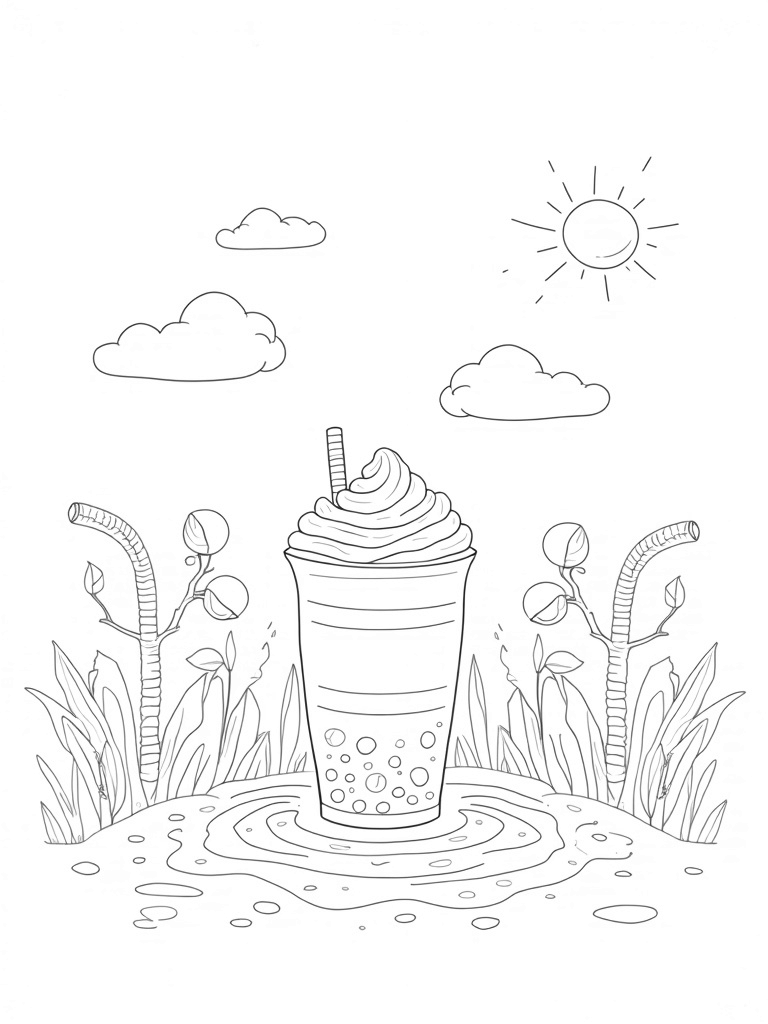 Boba Garden with Giant Tapioca Pearls and Whipped Cream Cup Coloring Page