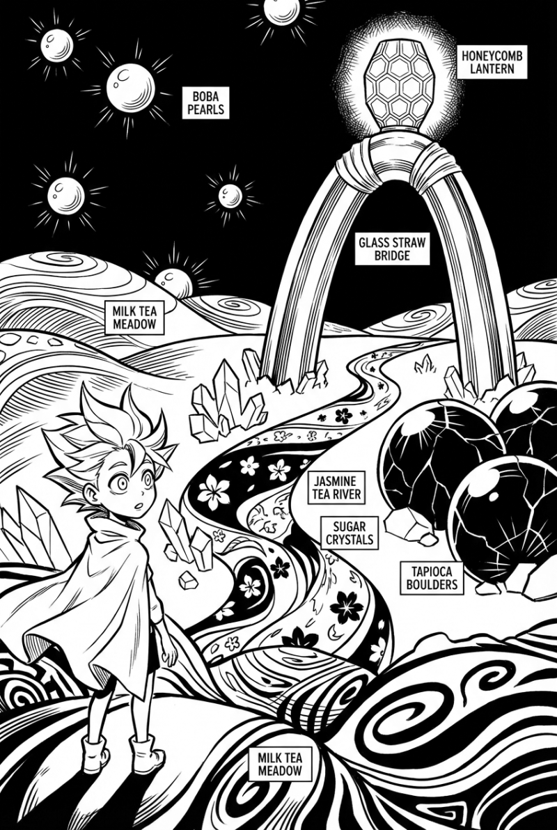 Imagine a wide‑open meadow made of swirly milk tea, with the sky dotted by glowing boba pearls like tiny lanterns. A clear jasmine‑tea river snakes right through the middle, its banks glittering with sugar crystals. Over the river arches a tall glass straw that works as a bridge, and at its tip floats a honey‑comb lantern. Scattered nearby are huge tapioca pearls that look like moon rocks, each cracked open to show a soft, inner glow.