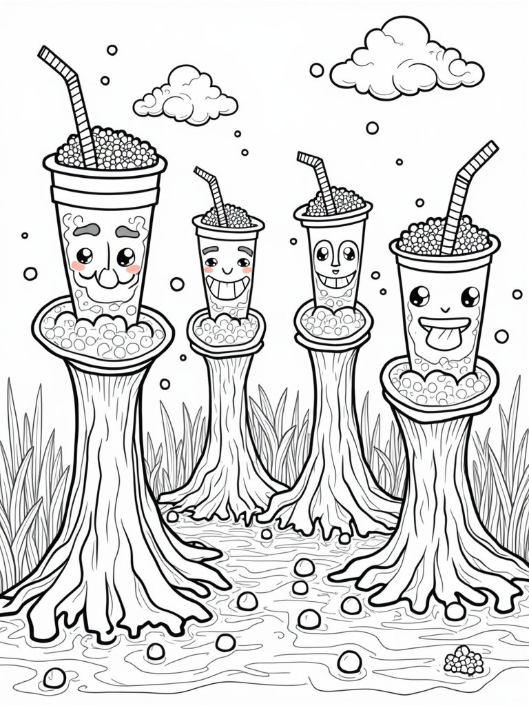Boba Tea Forest with Cheerful Cups and Playful Pearls Coloring Page