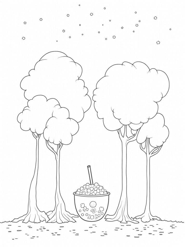 Check out this free, printable coloring page featuring a whimsical boba tea forest filled with giant cups, tapioca pearls, and delicate flowers. Perfect for kids who love boba and want to get creative with colors!
