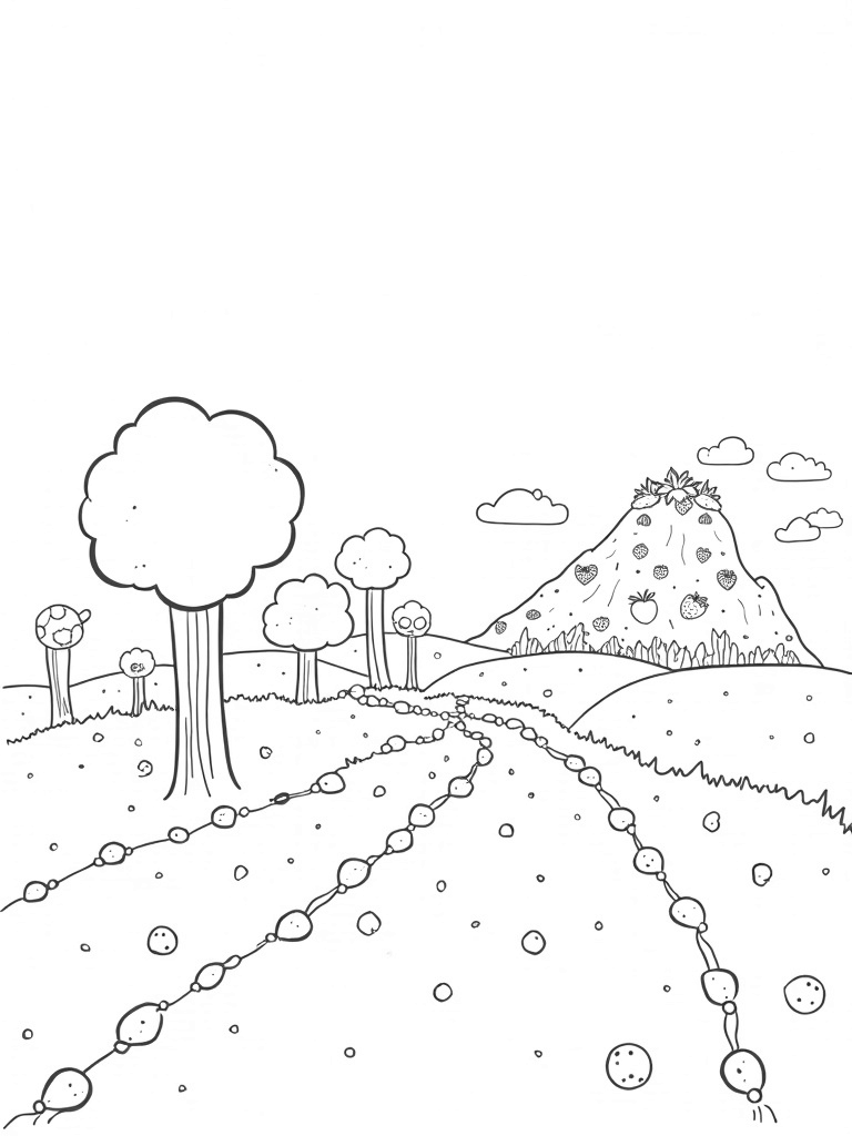 In the distance, a vibrant fruit mountain stands tall, decorated with enormous strawberries and juicy mangoes. It adds a splash of color to this dreamy landscape, making it even more inviting for little artists. Just think of all the colors you can use to bring this whimsical world to life!