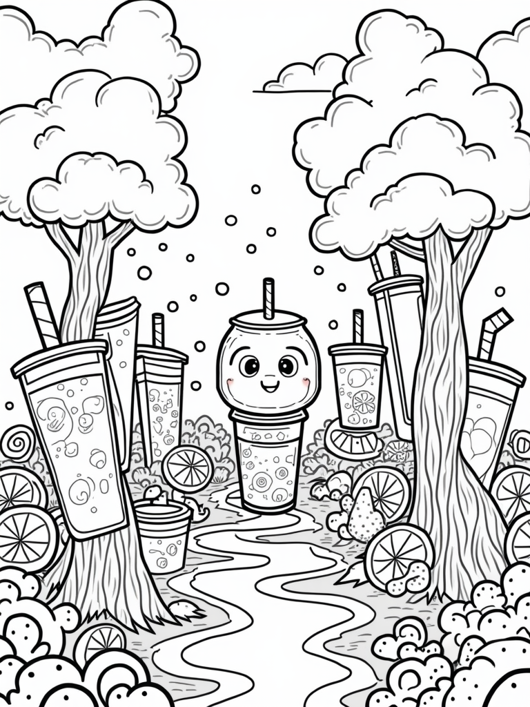 Boba Tea Forest with Playful Boba Character Coloring Page