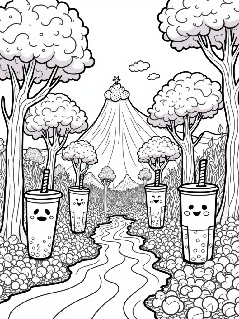 Boba Tea Forest with Smiling Tapioca Pearls Coloring Page