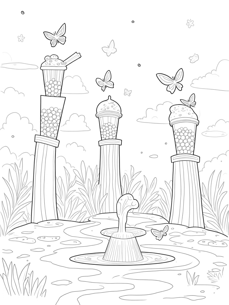 Boba Tea Garden with Colorful Cups and Butterflies Coloring Page