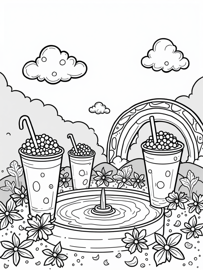 Boba Tea Garden with Colorful Cups and Sweet Treats Coloring Page