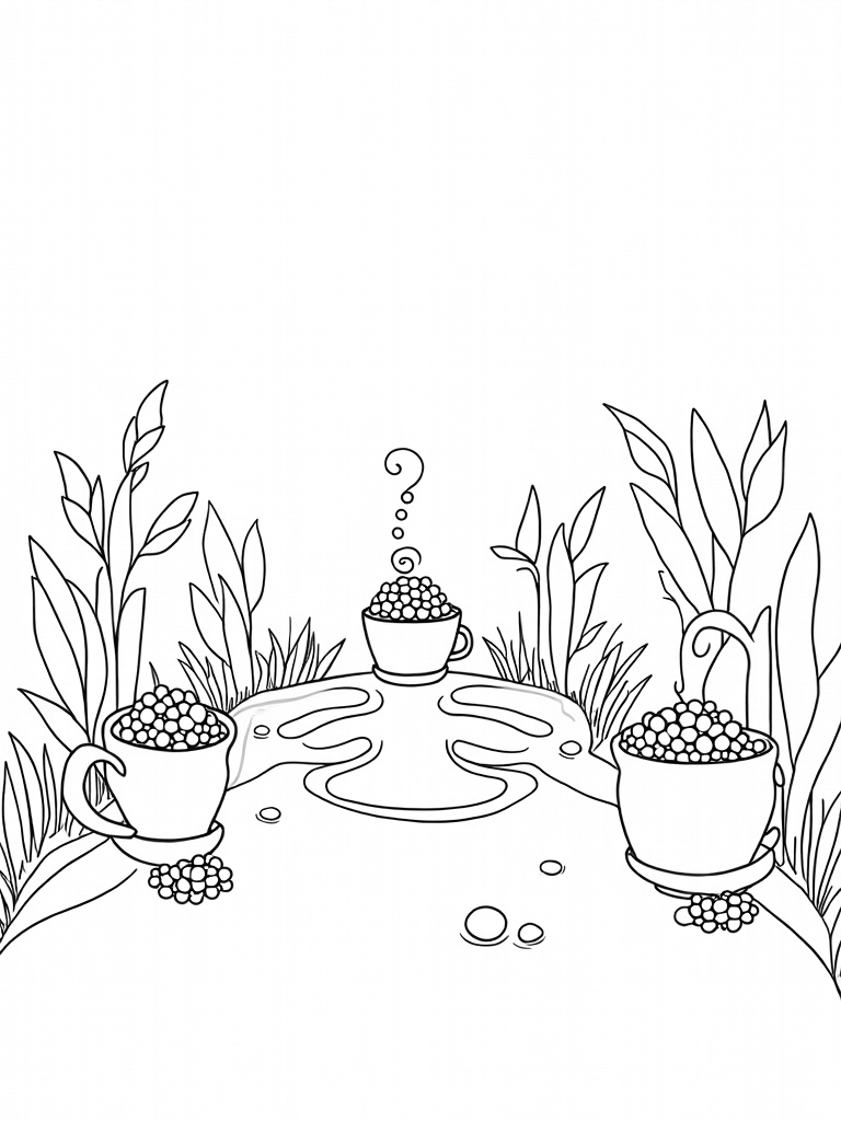 The coloring page showcases a fantastical boba tea garden where oversized, vibrant tea cups serve as flower pots. Each cup is overflowing with colorful tapioca pearls, making the whole scene pop with cheerfulness! Giant tea leaves stretch overhead, creating a lovely canopy that lets soft light filter through. In the center, a playful swirl of steam rises from the largest cup, twisting into fun shapes that spark the imagination.