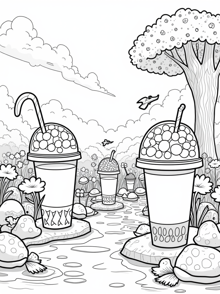 Imagine a garden where the flowers are actually towering tapioca pearls, sparkling in the sunlight! This coloring page is all about oversized cups filled with vibrant boba tea, each one dressed in fun patterns. A giant straw arches over a pond that's bubbling with fruity flavors, while candy-sized fruit slices float by, making it look like a sweet paradise.