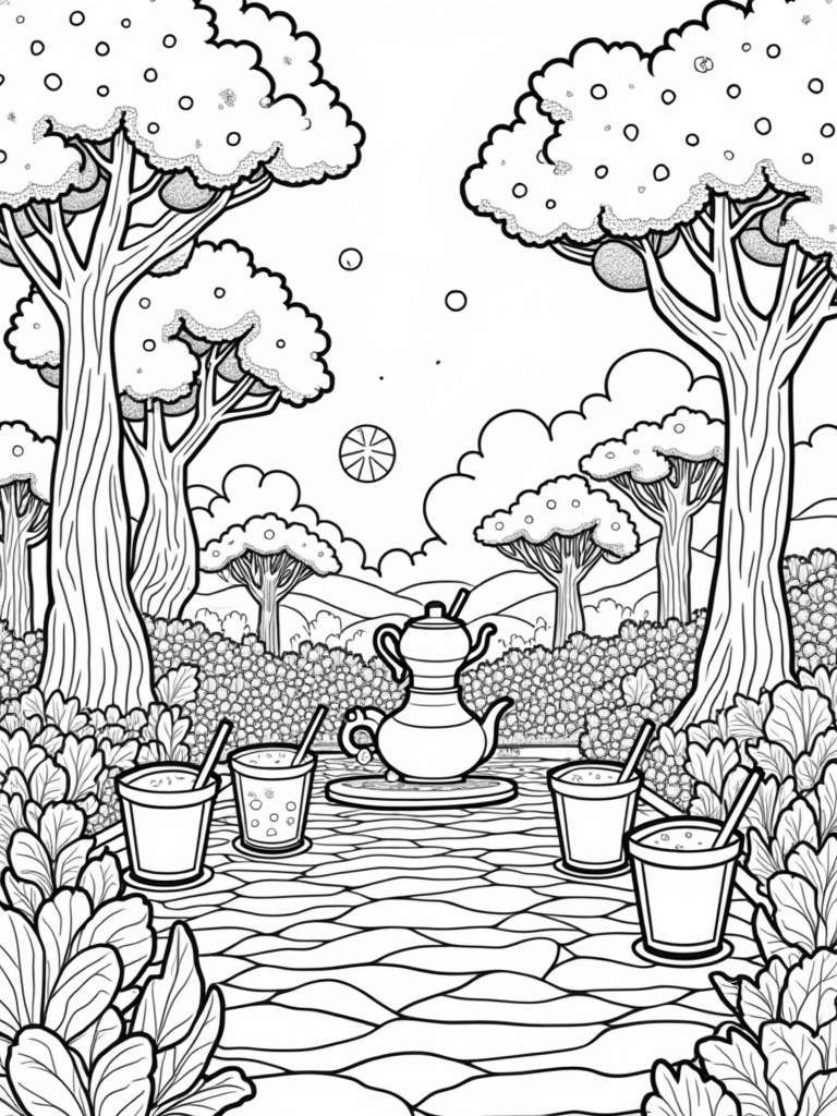 Right in the center, there's a teapot-shaped fountain bubbling over with frothy milk, surrounded by swirly tapioca plants that bloom in delicious shades of brown and cream. And check this out: fluffy clouds of whipped cream float by while a cheerful sun-shaped boba ball beams down, casting playful shadows. It’s a sweet spot for any young artist to fill with their favorite colors!