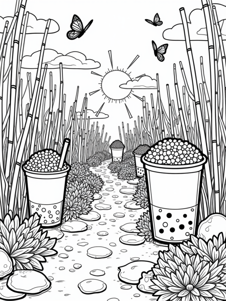 This fun coloring page showcases a delightful garden filled with oversized boba tea cups overflowing with vibrant tapioca pearls. You’ll notice towering bamboo straws that create playful tunnels, inviting little ones to imagine all sorts of adventures. A winding path made of gummy candy stones leads through lush bubble plants that sparkle with bubbles, making it feel like a sweet dream!