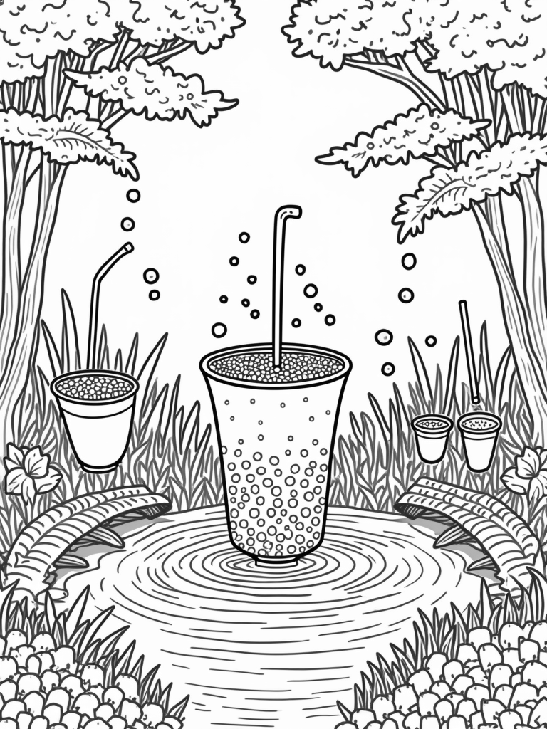 Boba Tea Garden with Colorful Tapioca Waterfalls Coloring Page