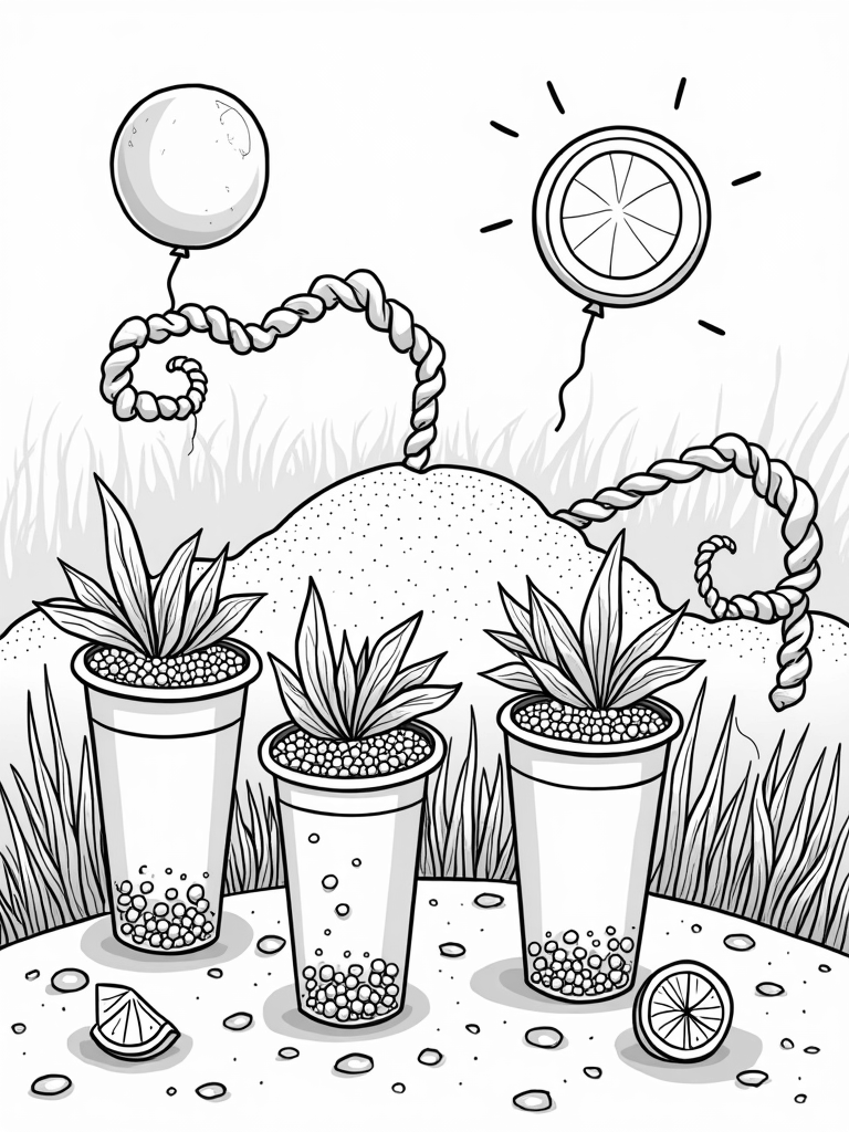 Imagine a magical garden where oversized boba tea cups are the stars! These giant cups are not just for sipping; they're filled with colorful tapioca pearls and lush green leaves sprouting right out of them. Overhead, you'll find giant straws twisting and turning, connecting to cheerful fruit-shaped balloons floating in the air. It’s a delightful sight perfect for coloring!
