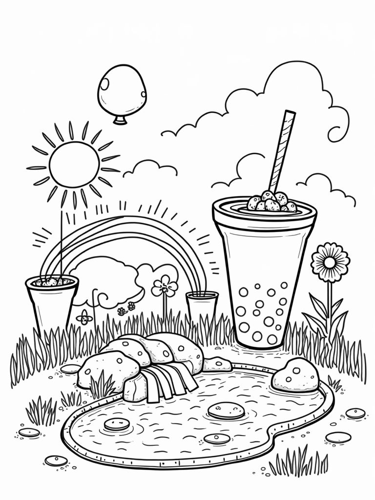 Imagine a garden where your favorite boba tea cups bloom like flowers! Each oversized cup is filled with vibrant, colorful drinks that look just as delicious as they are fun to color. Look up and you'll see giant tapioca pearls floating like balloons, adding a playful touch to this magical scene.