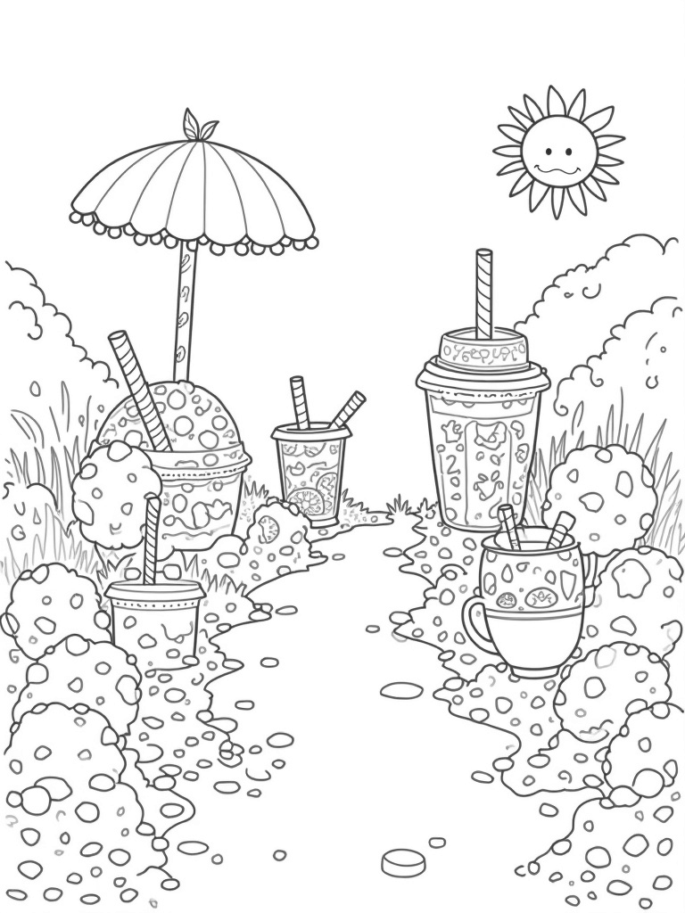 Get ready to color a magical boba tea garden! This free, printable coloring page features oversized boba cups, bubble bushes, and a smiling sun. Perfect for kids who love boba and fun colors!