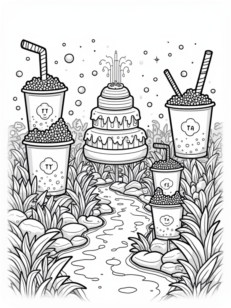 Boba Tea Garden with Giant Cups and a Cake Slide Coloring Page