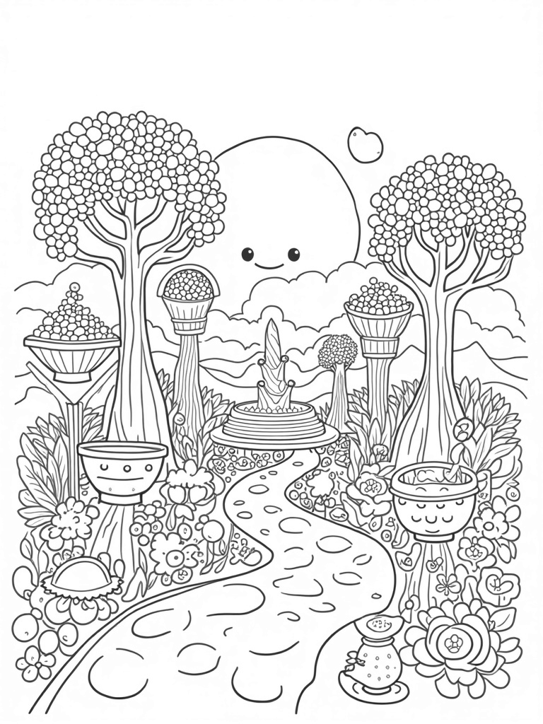 Boba Tea Garden with Giant Cups and Tapioca Pearl Sun Coloring Page