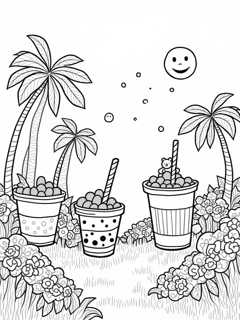 Look up, and you’ll see palm trees that are shaped like boba cups! They sway gently, casting fun shadows on the grassy ground. This boba tea garden is not just a feast for your eyes; it’s a playground for your imagination. Grab your colors and bring this whimsical world to life!