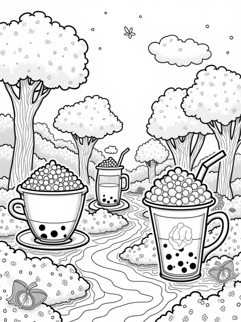 Grab your favorite crayons or markers and get ready to bring this boba tea garden to life! You can add your own twist by coloring the tapioca pearls in funky shades or giving the fruit trees unique patterns. The whimsical straws connecting the cups can be any color you want, and those fluffy clouds shaped like whipped cream are just waiting for your artistic touch. The possibilities are endless!