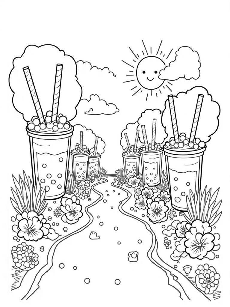Boba Tea Garden with Oversized Cups and Rainbow Straws Coloring Page