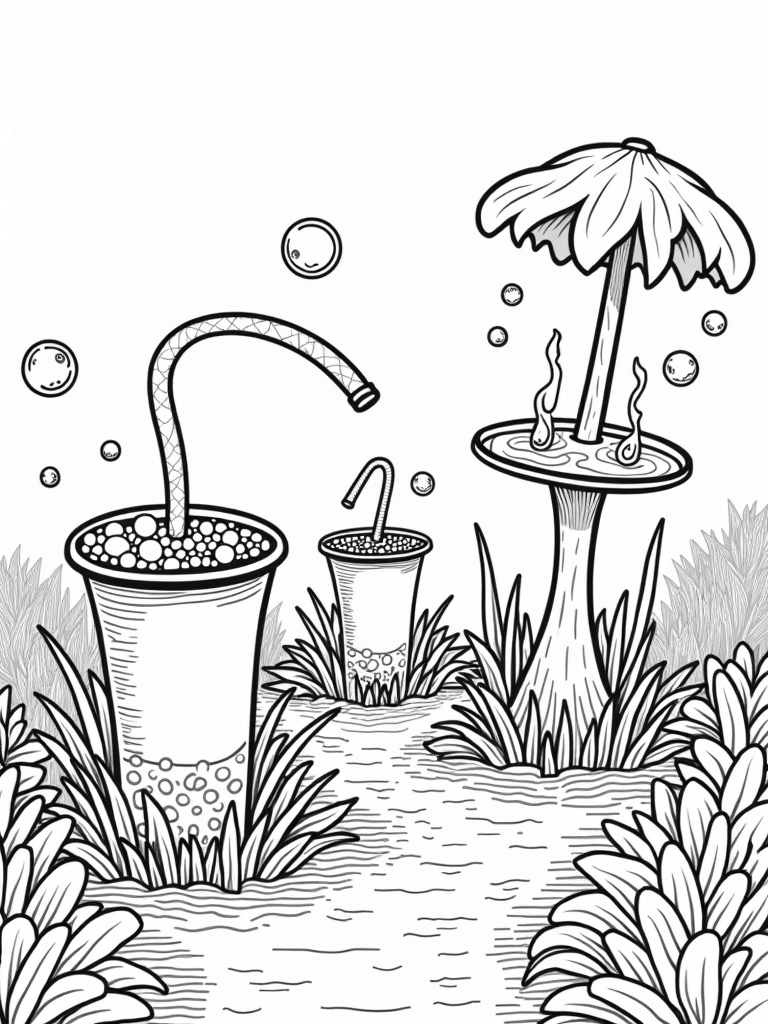 Picture a magical garden where oversized boba tea cups bloom like flowers! These fun cups are bursting with colorful bubbles that float above, adding a splash of joy to the scene. You can almost imagine the sweet aroma of fruity syrups in the air as you color in this delightful place.