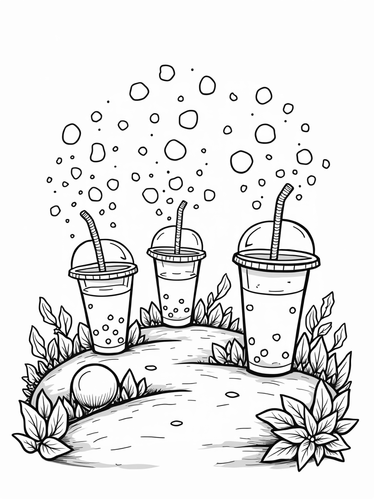 Boba Tea Garden with Oversized Cups and Tapioca Pearl Coloring Page
