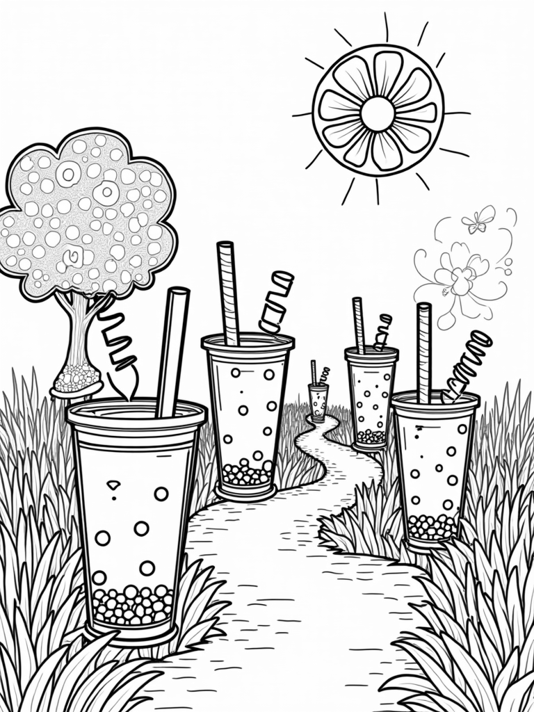 Boba Tea Garden with Oversized Cups and Whimsical Straws Coloring Page