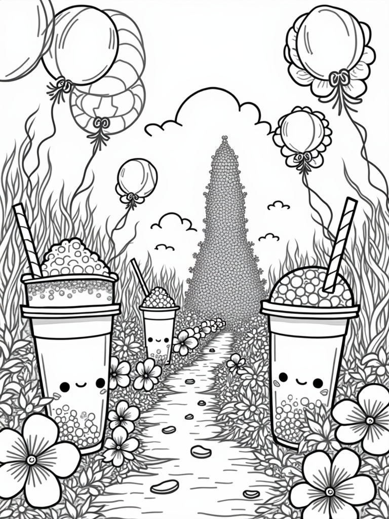 Check out this free, printable coloring page featuring a boba tea garden filled with smiling cups, floating tapioca pearls, and candy vines. Perfect for kids who love to color and explore fun themes!