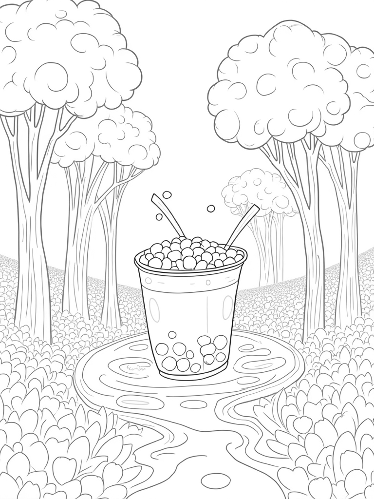 Boba Tea Garden with Tapioca Pearl Trees Coloring Page