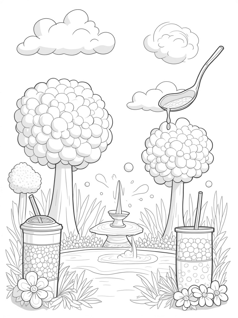 Boba Tea Garden with Tapioca Trees and Colorful Bubbles Coloring Page