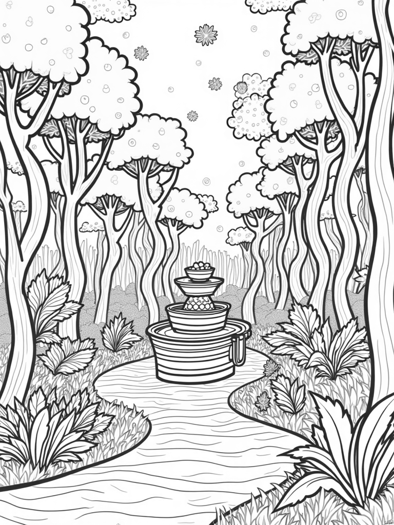 There’s so much to color in this boba tea garden! You can choose bright colors for the pearls and experiment with different shades for the swirling fruit flavors in the fountain. Don't forget the oversized tea bag leaves and the tiny teacups floating above; they’re just waiting for your artistic touch!