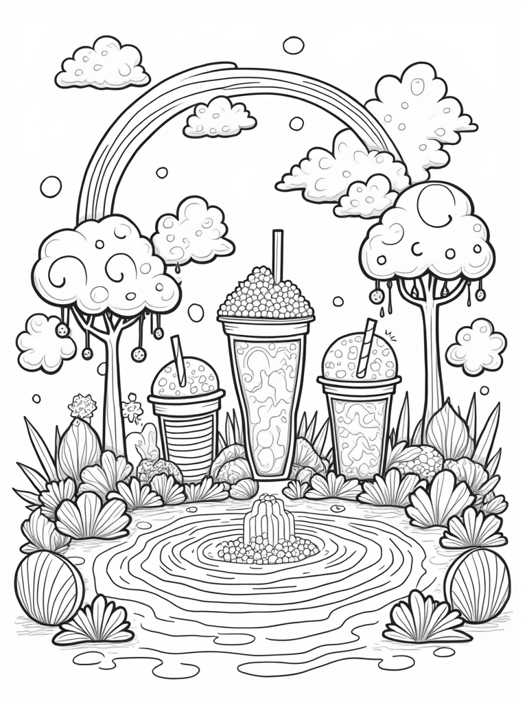 Boba Tea Garden with Whipped Cream Clouds Coloring Page