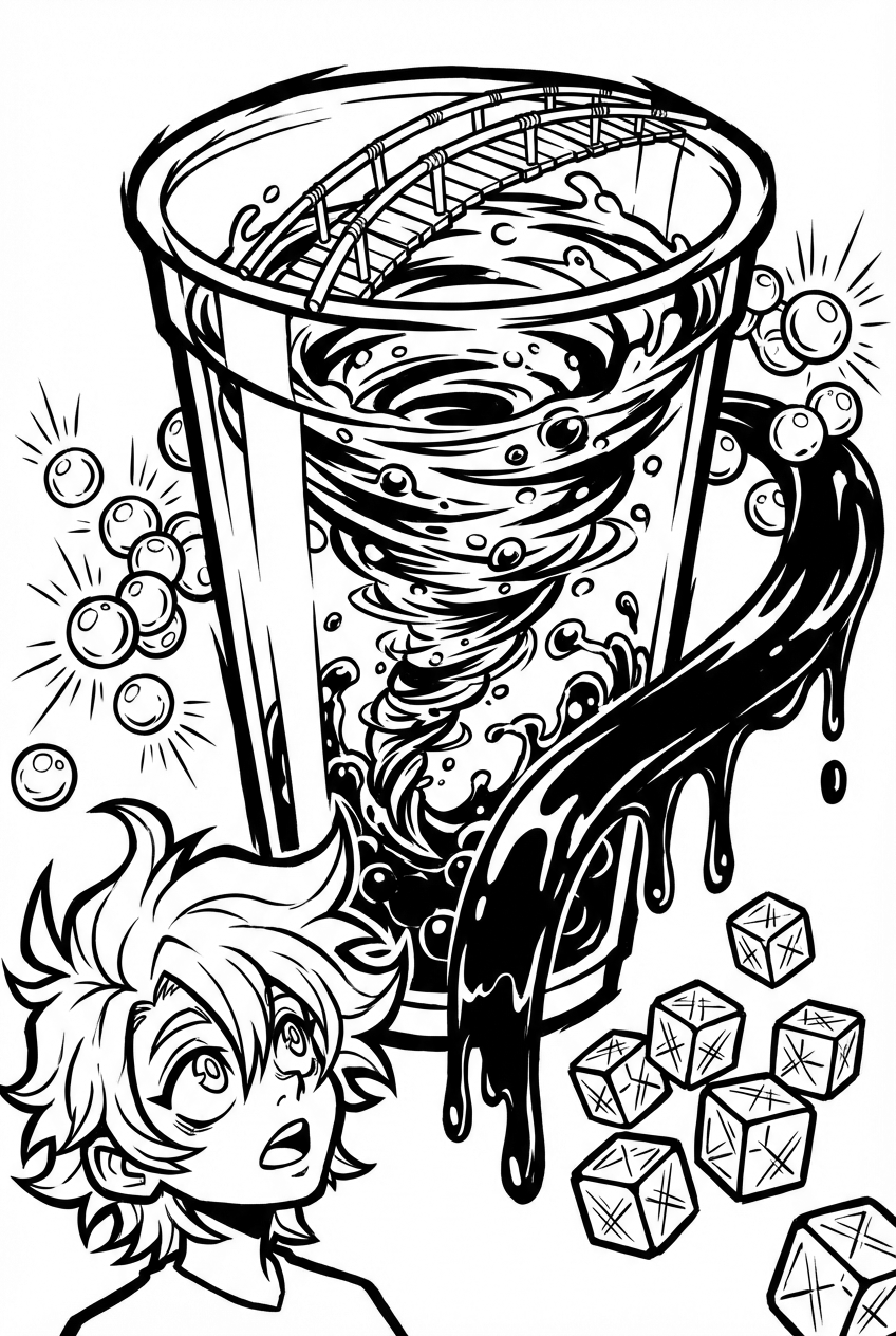 Picture a giant, see‑through boba cup stacked like a tower. Inside, a whirling tea vortex shoots up to a floating straw bridge, and tiny glowing tapioca pearls hover around the rim like little planets. A ribbon of honey drizzles down the side, spilling into a glossy waterfall, while a neat grid of ice cubes floats nearby as if they’re stepping stones.