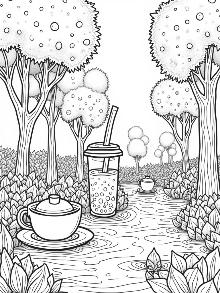 Boba Tree Garden with Bubble Tea Pond Coloring Page