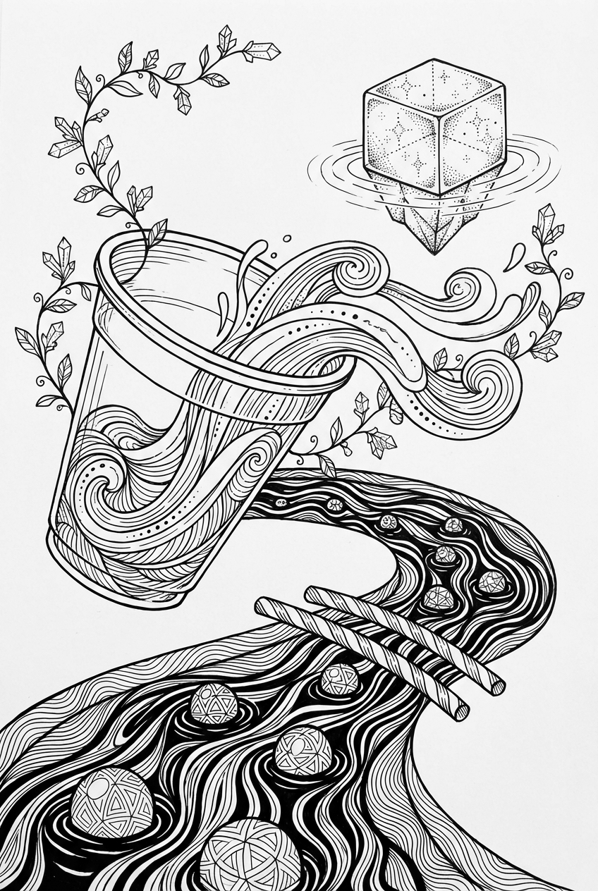 Imagine a giant clear cup blowing up like a volcano, spilling a glossy milk fountain that slides into a winding river of dark tea. Big, bouncy tapioca pearls float on the tea, acting like stepping stones that lead to a skinny bridge made of twisted straws. Up near the top, a glittery jelly cube hovers like an island, sending tiny ripples across the water. Around the cup’s rim, sugar‑crystal vines twist and frame the whole scene, all drawn in crisp black‑ink zentangle style.