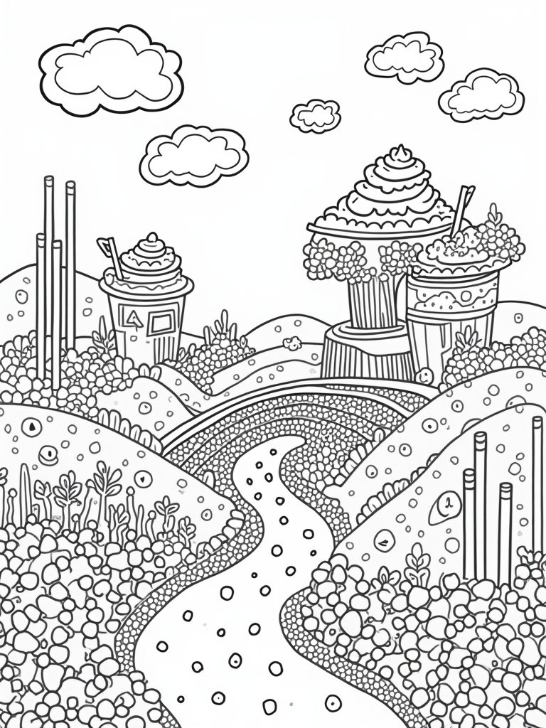 This coloring page is all about a magical boba wonderland! Imagine oversized tea cups turned into colorful treehouses, complete with fluffy whipped cream roofs. There’s a fun river of milk tea made from giant boba pearls rolling down a hill, and candy-shaped straws standing tall like flowers nearby.