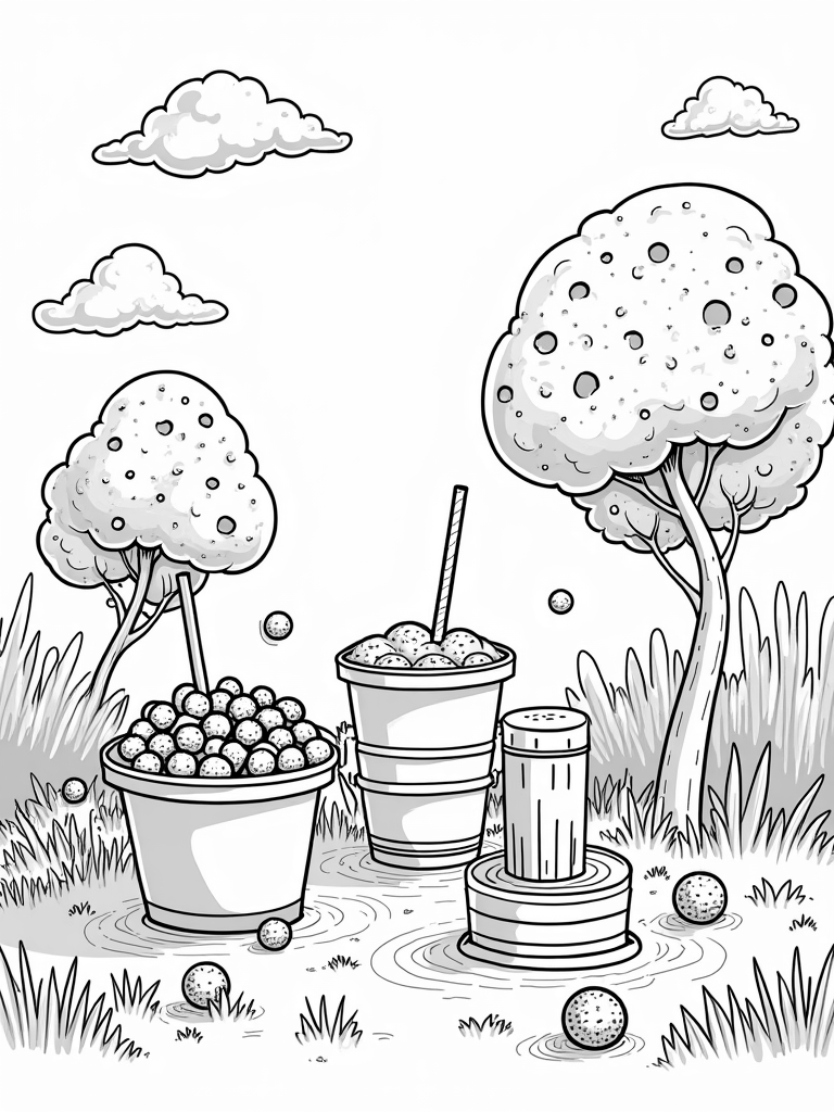 This page showcases a delightful boba tea garden where giant bubble tea cups are transformed into colorful planters. Picture oversized tapioca pearls rolling about like playful marbles on soft grass, while a tall matcha tree stands proudly, its leaves shaped like straws. In the background, a sparkling fountain flows with creamy goodness, sending ripples across the scene and revealing hidden fruit-shaped floaties. Above, fluffy clouds of whipped cream drift lazily, casting fun shadows on the ground.