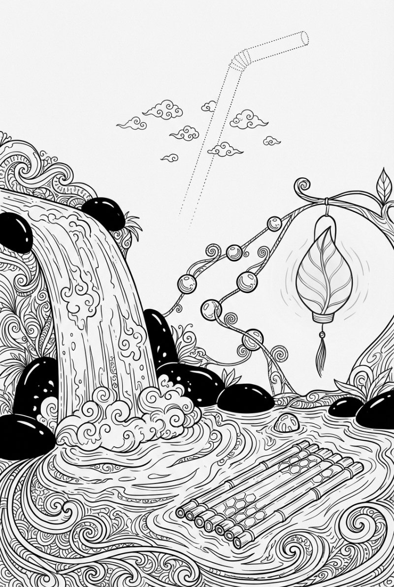 Take a look at the scene: a milk‑tea waterfall rushes over sleek black stones, spilling fluffy foam into a dark caramel pool. Tiny tapioca pearls bob up like little buoys, each tied to a thin, spiraled straw bridge that reaches for a glowing tea‑leaf lantern. A simple bamboo raft drifts nearby, its surface dotted with honeycomb‑shaped patterns that echo the bubbles below. Above it all, a handful of fluffy milk‑foam clouds trace a subtle straw shape in the sky, giving the whole picture a calm, guiding feel.