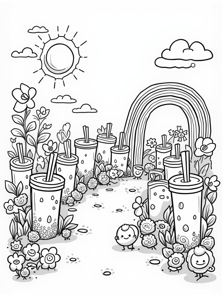 Oversized Boba Cups in a Whimsical Tea Garden Coloring Page